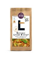Linsen rot* 64 %, texturierte Fleischalternative* 16 % [Erbsenprotein* (79,8 %), Fababohnenprotein* (19 %), Salz], Karottengranulat*, Paprikaflocken* rot, Tomatengranulat*, Gemüsebrühe* (Meersalz, Maisstärke*, Gemüsemischung* aus Karotten*, Zwiebeln* und Pastinaken*, Glukosesirup* aus Mais, Sonnenblumenöl*, Gewürzmischung* aus Kurkuma*, Ingwer*, Muskat* und Pfeffer*, Kräutermischung* aus Petersilie*, Liebstöckel* und Lorbeerblättern*), Lauchflocken*, Zwiebelgranulat*, Meersalz, Paprika edelsüß* gemahlen, Petersilie*, Kräuter der Provence* (Thymian*, Bohnenkraut*, Oregano*, Rosmarin*, Lorbeer*, Basilikum*, Lavendelblüten*), Pfeffer schwarz*, Koriander*, Knoblauchgranulat*| Energie | Fett | gesättigte Fettsäuren | Kohlenhydrate | Zucker | Ballaststoffe | Eiweiss | Salz |
