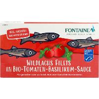 WILDLACHS (60%) (Oncorhynchus spp.), *Tomatenmark (25%), *Sonnenblumenöl,*Rohrzucker, *Branntweinessig,*Meersalz, *Basilikum (1%), *Zwiebelpulver,Verdickungsmittel: *Guarkernmehl.| Energie | Fett | gesättigte Fettsäuren | Kohlenhydrate | Zucker | Eiweiss | Salz |