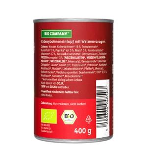 Wasser, Kidneybohnen* 18 %, Tomatenmark*, Kartoffeln* 9%, Paprika* rot 5%, Mais* 5%, Karottenstücke* (Karotten* 3,7%, Antioxidationsmittel: Citronensäure), Zwiebeln*, WEIZENerzeugnis* 3 % (WEIZENGLUTEN*, WEIZENVOLLKORNSCHROT*, WEIZENKLEIE*, Meersalz), Gemüsebrühe* (Meersalz, Zwiebeln*, Lauch*, Karotten*, Pastinaken*, Petersilie*, Kurkuma*, Knoblauch*, Muskat*, Liebstockblätter*, Pfeffer*), Meersalz, Rohrohrzucker*, Verdickungsmittel: Guarkernmehl*, Chili* 0,13%, Knoblauch*, Koriander*, Kreuzkümmel*| Energie | Fett | gesättigte Fettsäuren | Kohlenhydrate | Zucker | Ballaststoffe | Eiweiss | Salz |