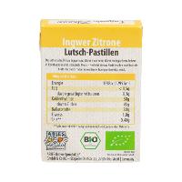 Geliermittel: Gummi arabicum*, Zucker*, Glukosesirup*, Bienenhonig 7,5%*, Isländisch Moos Extrakt 1,4%, Zitronensaftkonzentrat* 0,8%, Zitronenöl* 0,5%, Ingweröl* 0,3%, Vanilleextrakt*. Trennmittel: Carnaubawachs*| Energie | Fett | gesättigte Fettsäuren | Kohlenhydrate | Zucker | Ballaststoffe | Eiweiss | Salz |