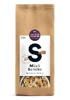 HAFERFLOCKEN*, Zartbitterschokolade* 11% (Kakaomasse*, Rohrohrzucker*, Kakaobutter*), Schoko-Reiscrispies* 10 % (Reis*, WEIZENMEHL*, Zucker*, Kakaopulver* entfettet 4 %, GERSTENMALZMEHL*, Meersalz), WEIZENFLOCKEN*, Cornflakes* (Mais*, Sonnenblumenlecithin*).| Energie | Fett | gesättigte Fettsäuren | Kohlenhydrate | Zucker | Ballaststoffe | Eiweiss | Salz |