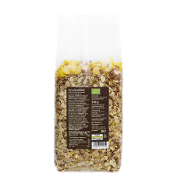 HAFERflocken* (43,8 %), WEIZENflocken* (35 %), Cornflakes* (Mais*, Emulgator: Sonnenblumenlecithin*), Zartbitterschokolade* (6,5 %) (Kakaomasse*, Rohrohrzucker*, Kakaobutter*), kakaohaltiges Reis-Extrudat* (6,5 %) (Reis*, Rohrohrzucker*, Kakaopulver*, GERSTENmalz*)| Energie | Fett | gesättigte Fettsäuren | Kohlenhydrate | Zucker | Ballaststoffe | Eiweiss | Salz |